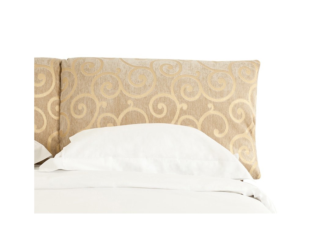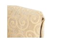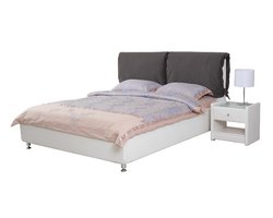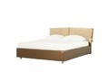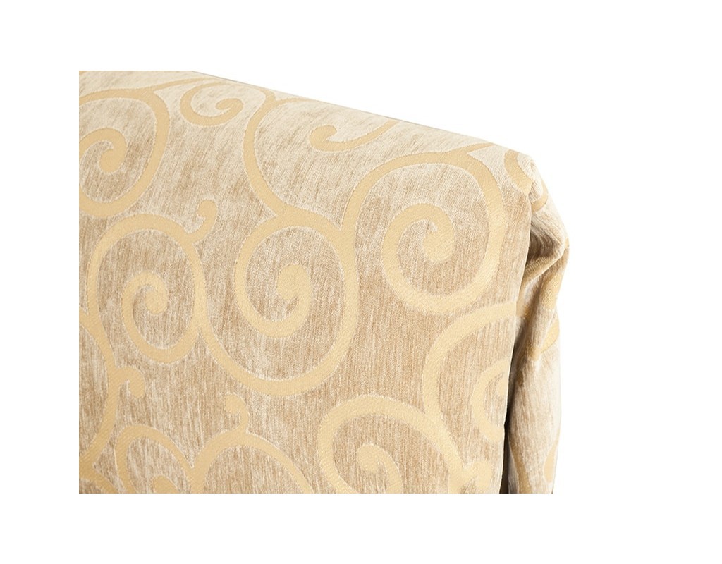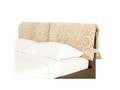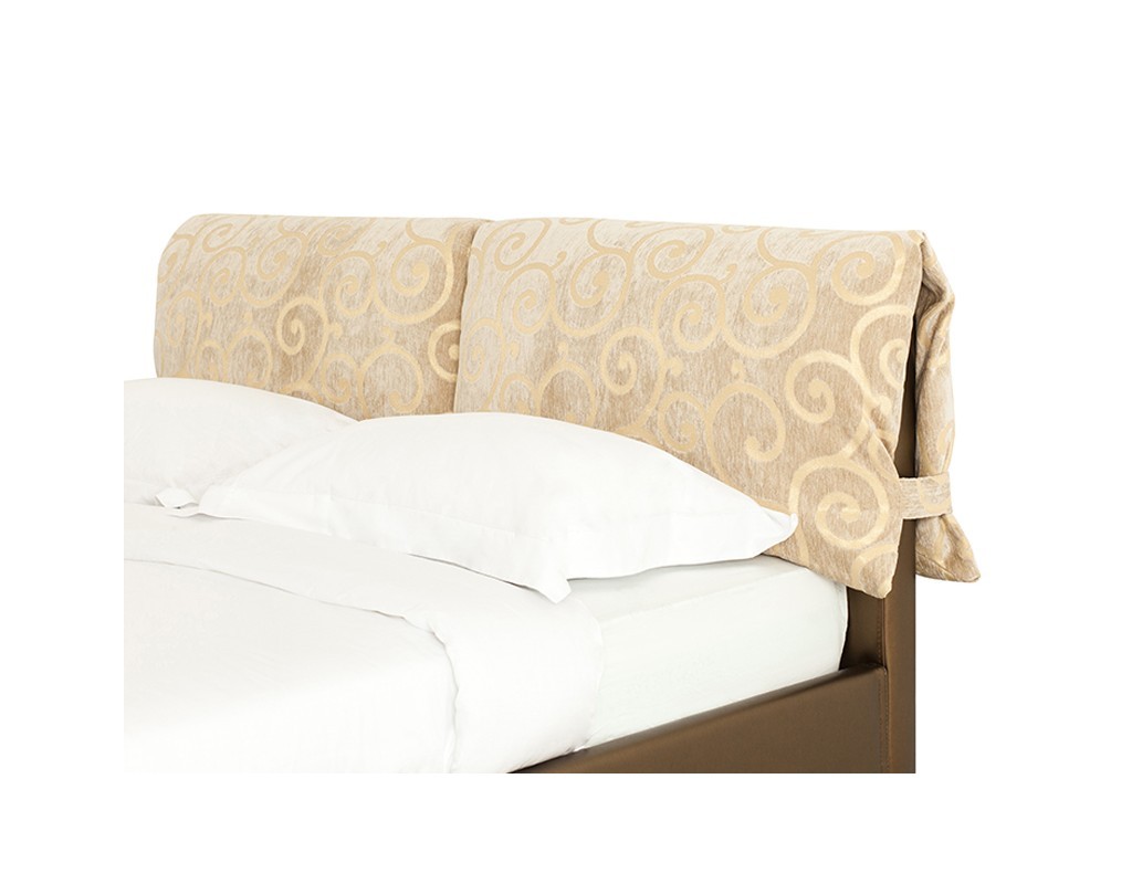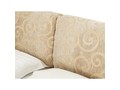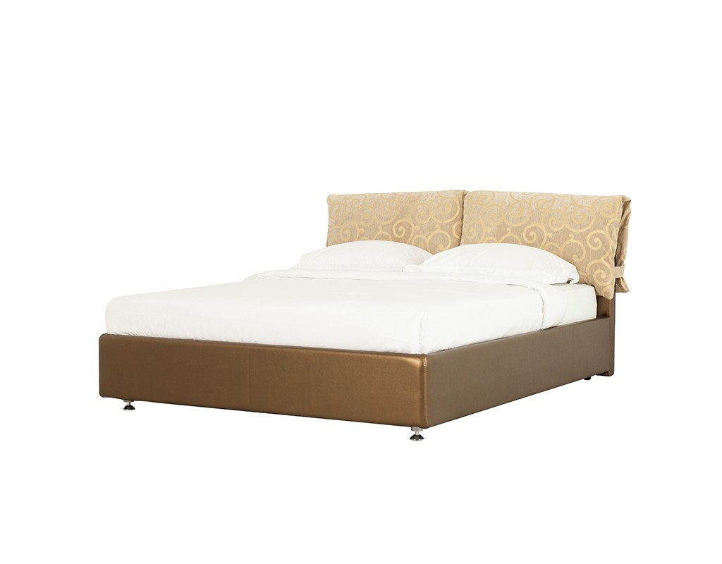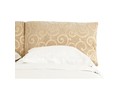 Интересный дизайн изделия создает съемное мягкое изголовье, выполненное из дорогой обивочной ткани с оригинальным рисунком. За счет объемных деталей изголовья кровать выглядит очень уютно и привлекательно. По всему внешнему периметру обивка кровати выполнена из качественного винила благородного золотисто-орехового цвета.